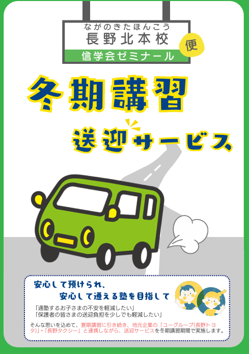 ※既に信学会ゼミナール長野北本校での冬期講習を申し込み済みの方でも当サービスをお申し込みいただけます。ご希望の方は下記へご連絡ください。