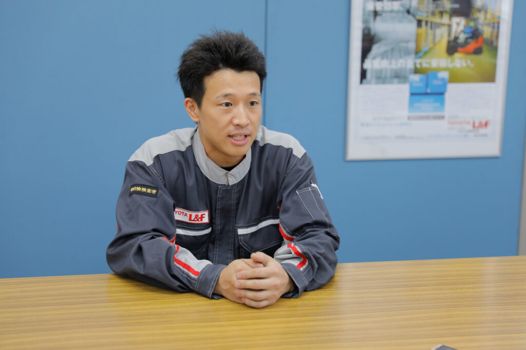 現在携わっているフィールドエンジニアは、お客さまの会社に出向いて、現場で使っているフォークリフトの点検、修理、整備をすること。入社後、約5年はショップエンジニア(自社工場内での点検整備)で技術や経験を積み、その後は1人で出張作業をしています。
